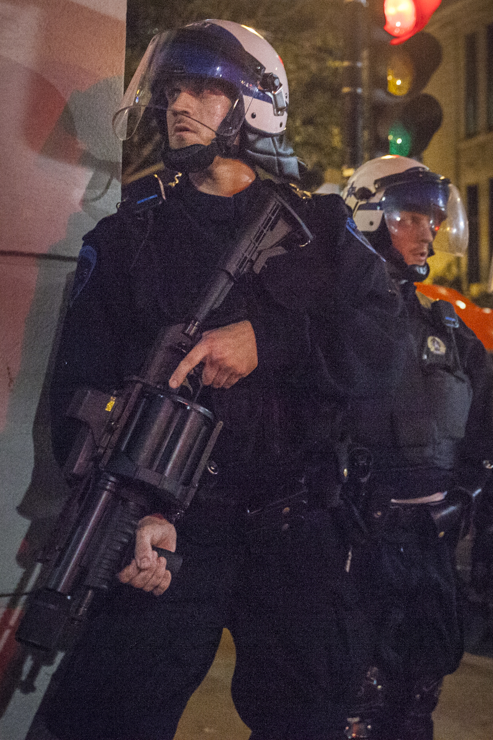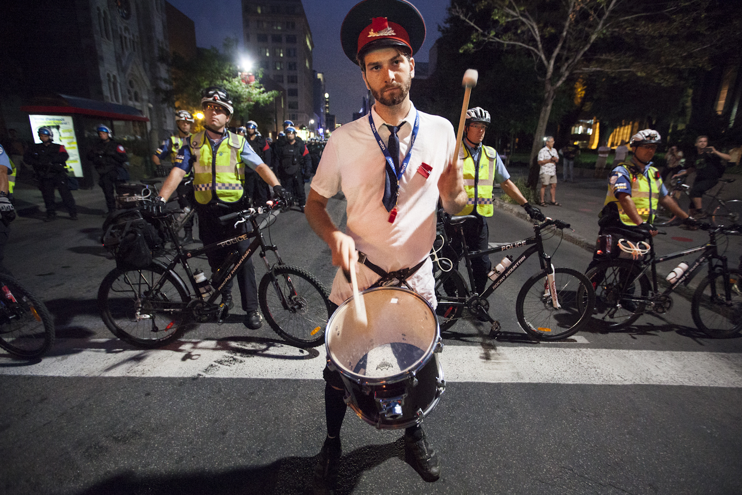 Tout juste avant le coup d’envoi de la marche vers 21h, les manifestants qui n’avaient pas participé à une marche de nuit depuis quelques temps ont pu retrouver la voix du Sergent Simoneau qui, des haut-parleurs du camion du SPVM, déclarait la manifestation illégale avant même qu’elle n’ait commencé.