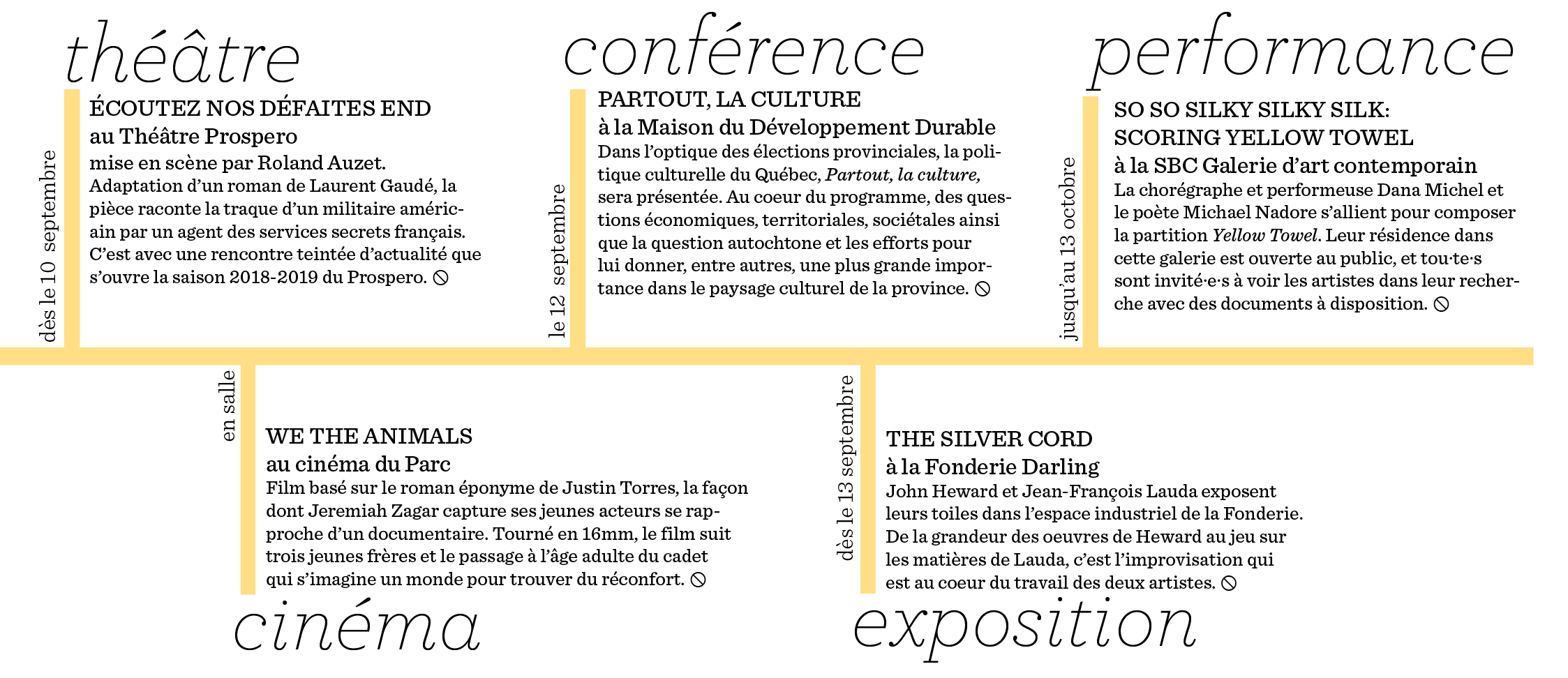Calendrier culturelQuels objets culturels rencontrer ces prochains jours ? par Grégoire Collet18 septembre 201818 septembre 2018Culture Tweeter Evangéline Durand-Allizé | Le DélitEvangéline Durand-Allizé | Le Délit Webmestre, Le Délit | Le Délit Articles en lien Calendrier Culturel 12 septembre 201713 septembre 2017 Grégoire Collet | Le Délit Calendrier culturel 6 novembre 20186 novembre 2018 Violette Drouin, Niels Ulrich Calendrier culturel 14 janvier 2020
