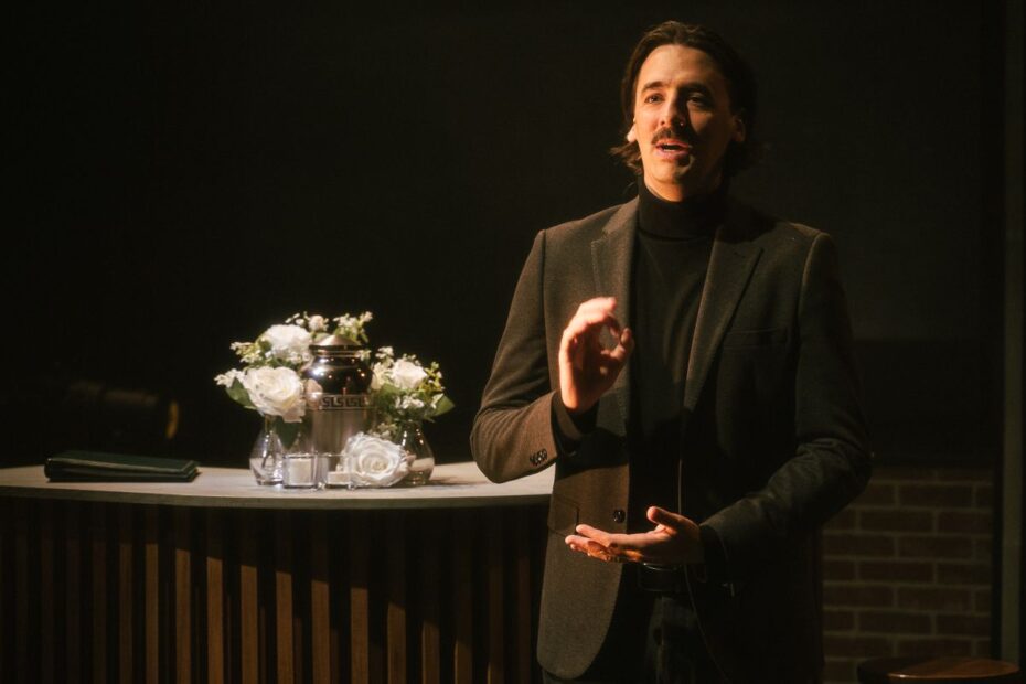 Sur une musique d’ambiance, Gabriel dépose un album noir sur le comptoir, à côté de quelques petits bouquets blancs et d’une urne. La salle se tait. C’est ainsi que débute le monologue Merci d’être venus, rédigé et interprété par Gabriel Morin en collaboration avec le metteur en scène David Strasbourg. La pièce, parue en 2023, a remporté le prix du Meilleur texte original de l’Association québécoise des critiques de théâtre, dans la section Québec, en 2024.
